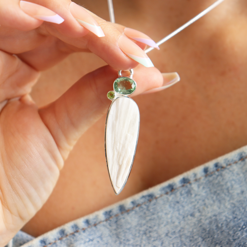 Extremely unique are these natural Selenite Amethyst Peridot pendants. Each with a small Peridot and larger Green Amethyst at top. The raw beauty of the Selenite is the materpiece though of these elegant boho jewels.
