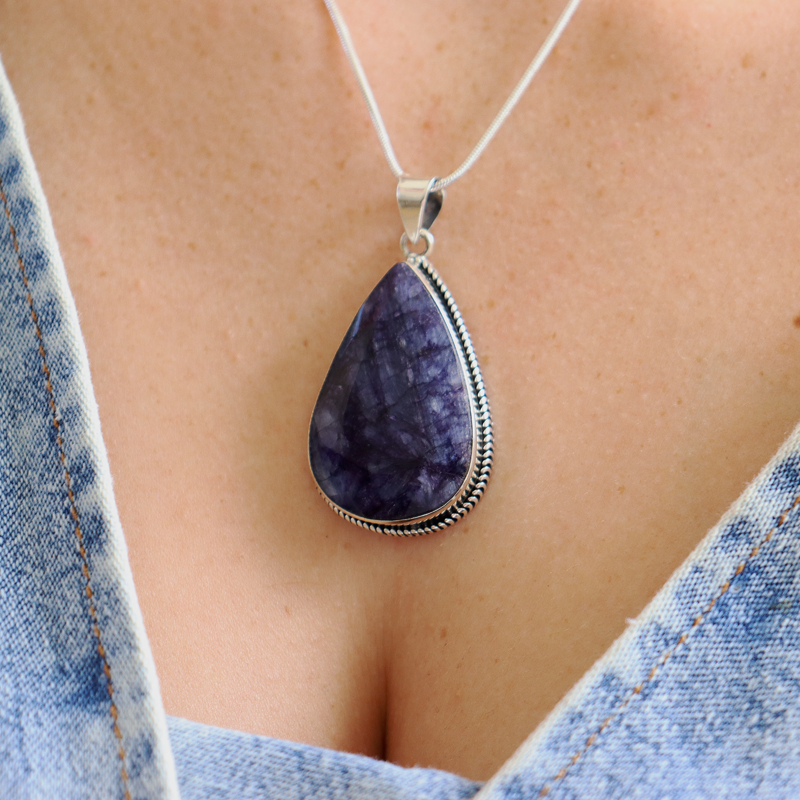 With a brilliant deep blue our Nilaan Sapphire Quartz boho pendant is a showstopper! Set in solid sterling silver and boasting a classic boho gypsy vibe.