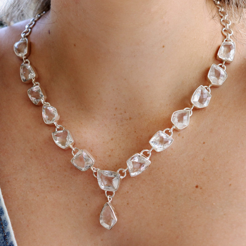 This. Is. Stunning. Our Raan Clear Quartz silver necklace features fourteen gems each in their own sterling silver bezel settings. A unique one-off jewel for those of elegance.