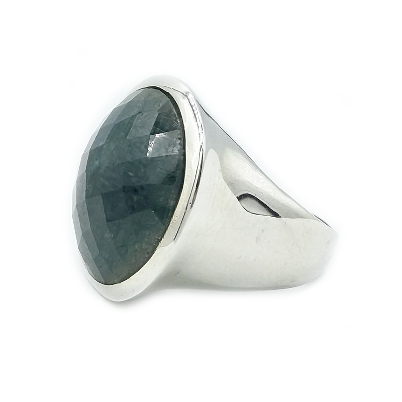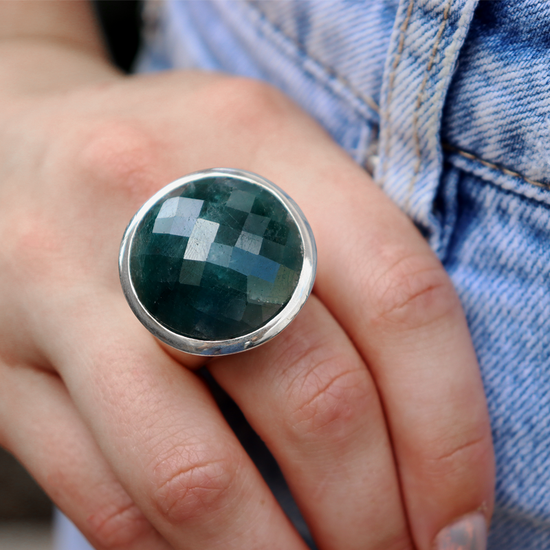 If you want to be noticed, here's your sign! This stunning big Emerald Quartz chunky gemstone ring is chekerboard cut and set in solid sterling silver. The round gem is a stand out and makes a statement like no other. A one-of-a-kind piece for those who have an obvious elegance to them.