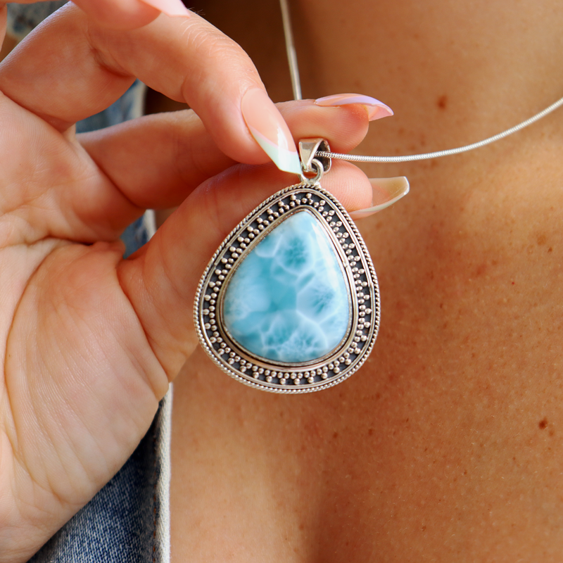 Wear the timeless beauty of blues and opaque whites with this Larimar teardrop boho silver Pendant. Crafted from sterling silver with boho style accents, this piece is set with genuine Larimar. Enjoy its unique and beautiful design.